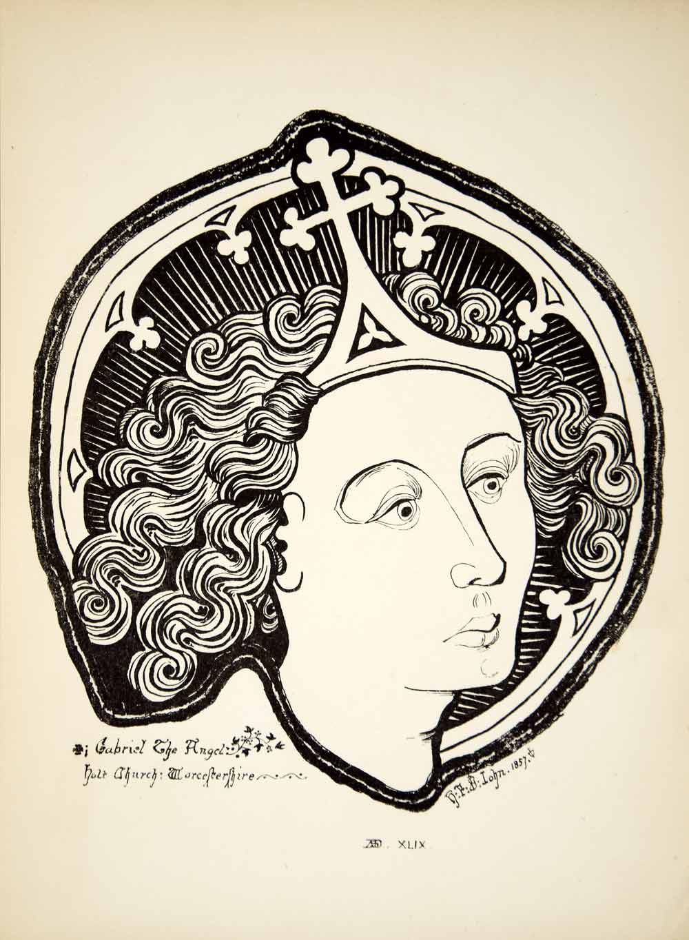 This is an original 1857 black and white lithograph of an illustration by H.F. St. John of a late 14th century or early 15th century painting of the angel Gabriel inside Holt Church in Worcestershire, England, United Kingdom.