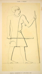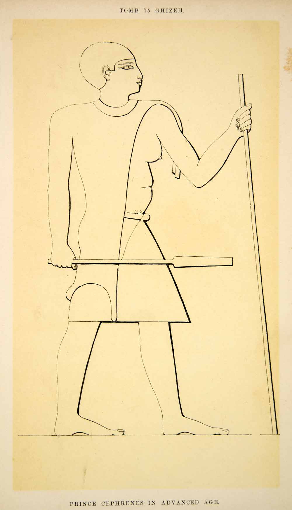 This is an original 1857 two-color relief line-block print of the prince Khafra in advanced age found in the tomb 75 Giza, Egypt. Khafra or Chephren (Cephrenes)was an Egyptian pharaoh during the 4th Dynasty in Egypt.