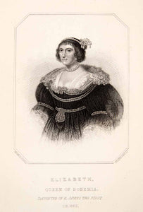 This is an original 1857 black and white steel engraving of a portrait of Elizabeth, Queen of Bohemia and daughter of King James the First of England.