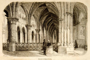 This is an original 1857 black and white in-text wood engraving that depicts the interior of the Saint Severin Church in Paris, France. Saint Severin was a hermit who lived along the banks of the Seine River in the early 5th century.
