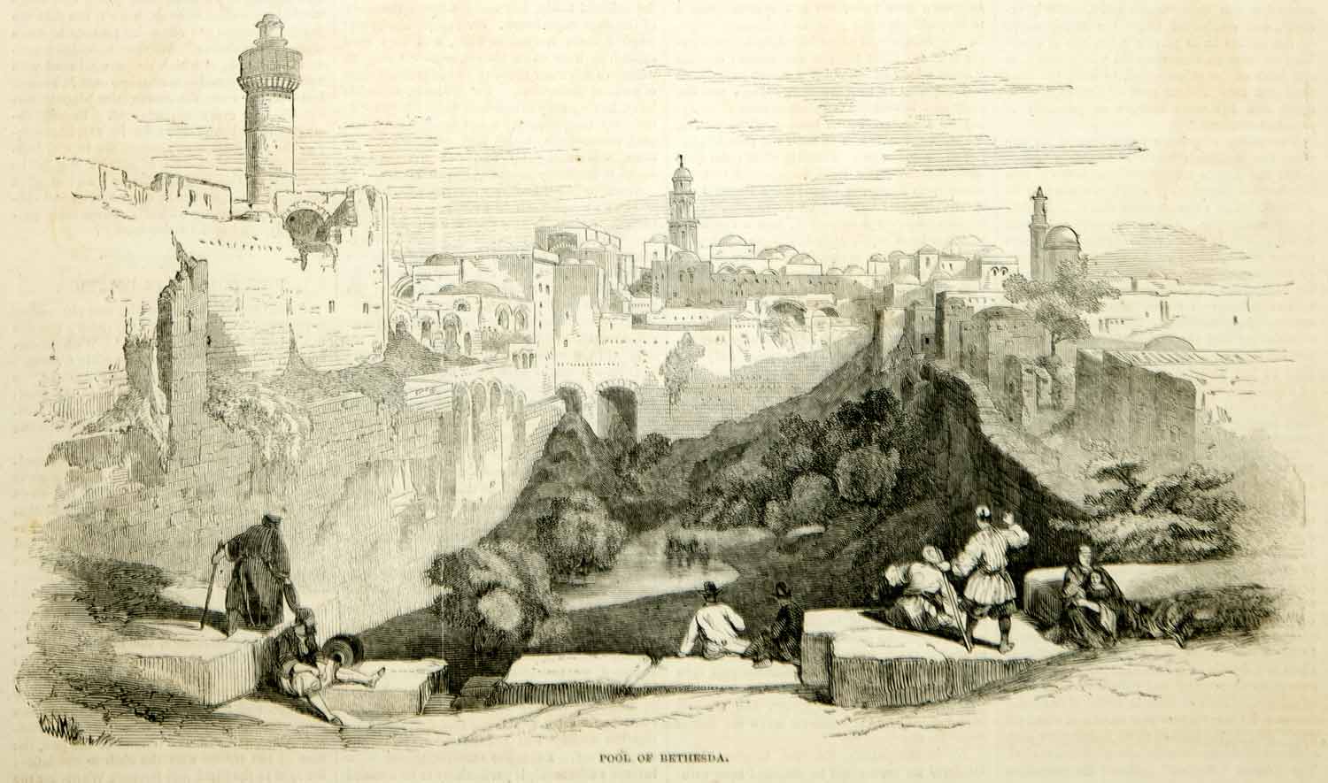 This is an original 1857 monochrome in-text wood engraving that depicts the Pool of Bethesda in the Muslim Quarter of Jerusalem. It was here that the Bible says Jesus Christ healed a paralyzed man.