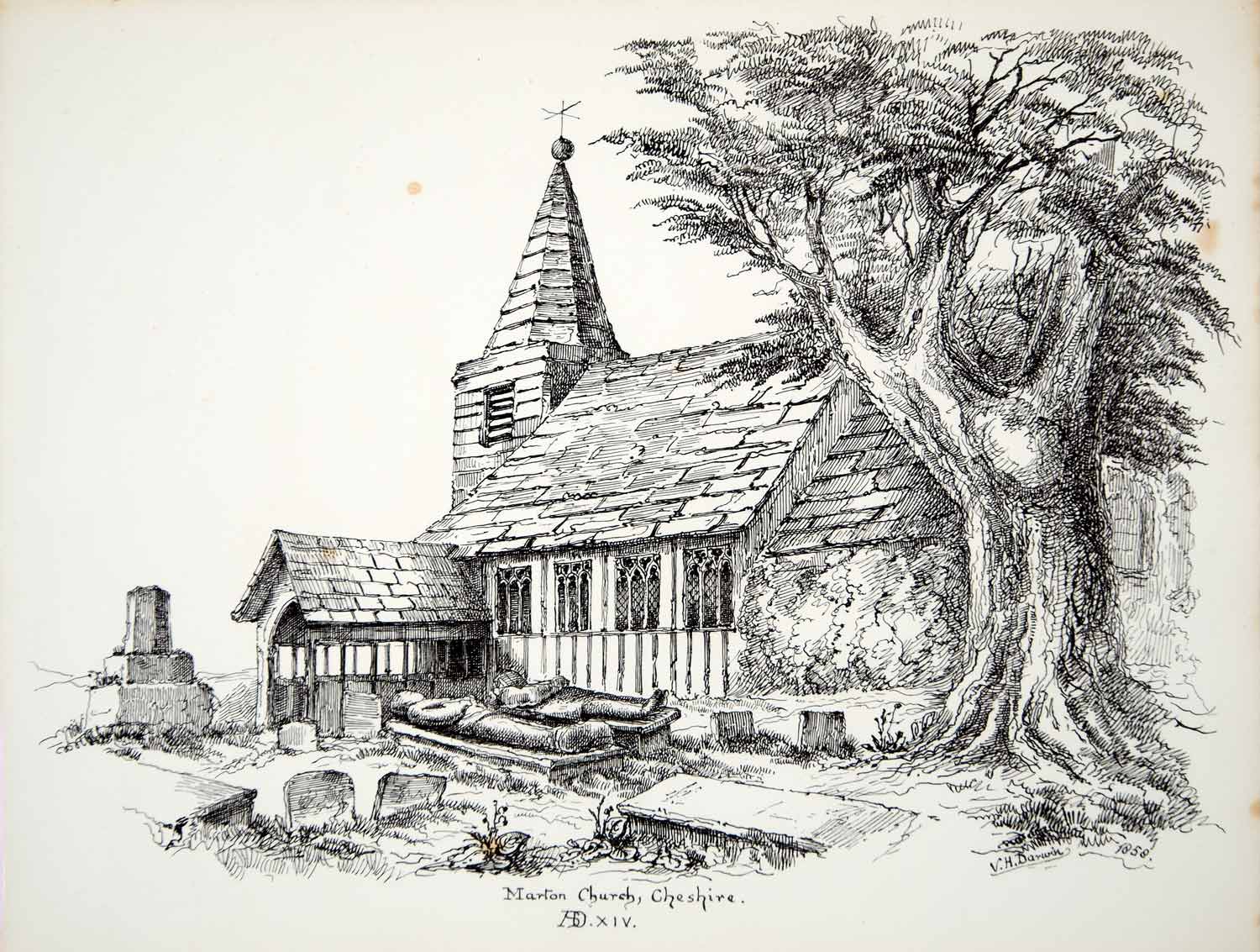 This is an original 1858 black and white lithograph of an illustration by V.H. Darwin of timber-framed the Church of St. James and St. Paul in the village of Marton, Cheshire, England. The church is also designated a Grade I listed building by English Heritage.