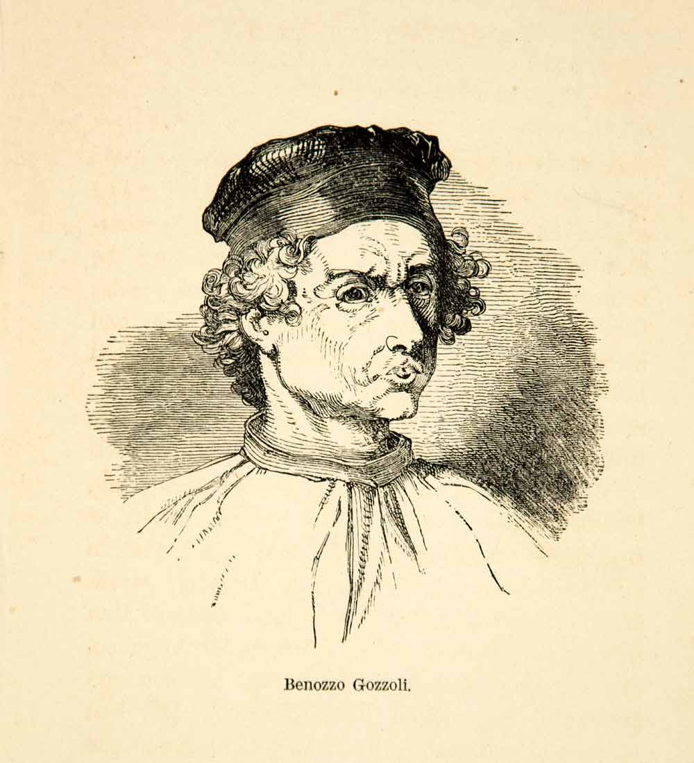 This is an original 1858 black and white relief line-block print of a portrait of Italian Renaissance painter and artist, Benozzo Gozzoli (born Benozzo di Lese).