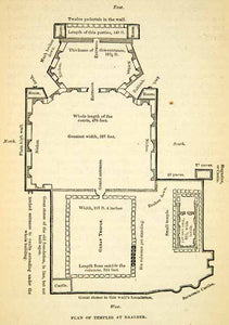 This is an original 1858 black and white relief line-block print of artwork that depicted the interior floorplan of the ancient Roman temples from the archeological site of Baalbek in the Beqaa Valley of Lebanon, Middle East.