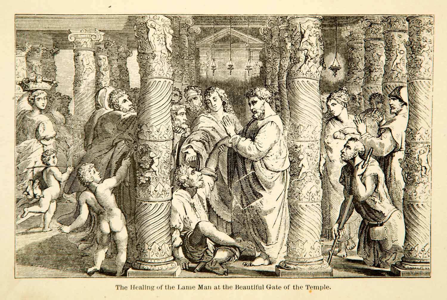 This is an original 1858 black and white relief line-block print of an Italian Renaissance painting by Raphael that portrays Saint Peter and John the Evangelist healing a lame man at the Beautiful Gate of the Temple in Jerusalem, Israel.