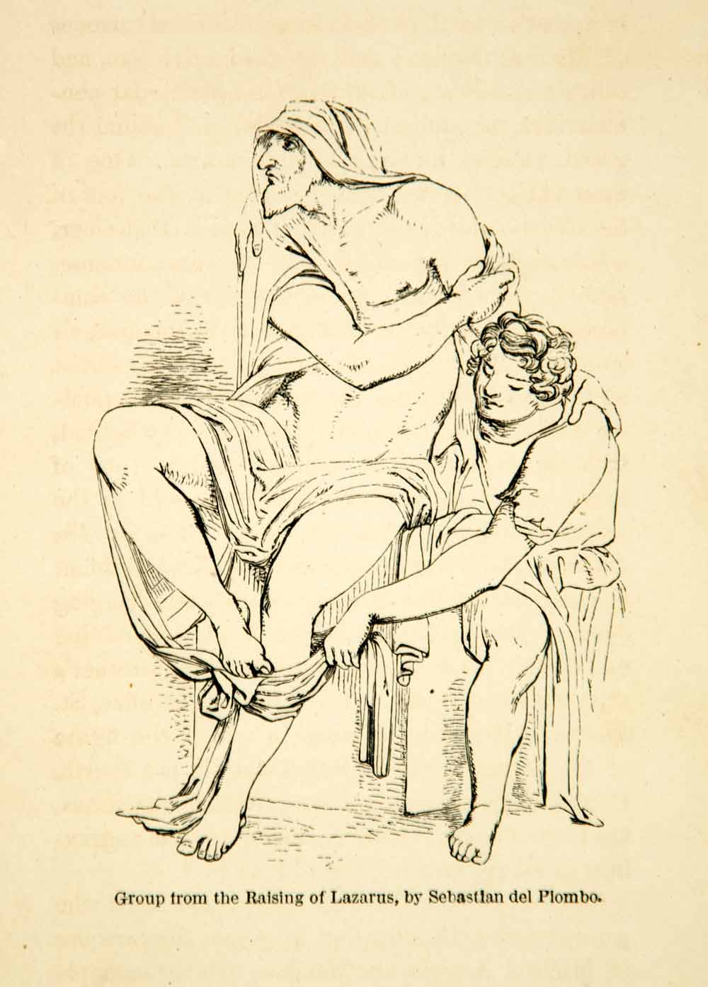 This is an original 1858 black and white relief line-block print of figures from an Italian Renaissance painting by Sebastiano del Piombo that portray Lazarus being raised from the dead by Jesus Christ.