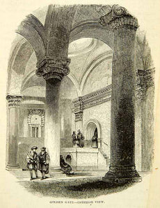 This is an original 1858 black and white in-text wood engraving of artwork that depicted the interior architecture of the Golden Gate in the Old City of Jerusalem, Israel in the Middle East.