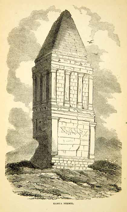 This is an original 1858 black and white wood engraving of artwork that depicted an ancient monument along the road to Kamua Hermel, Lebanon in the Middle East.