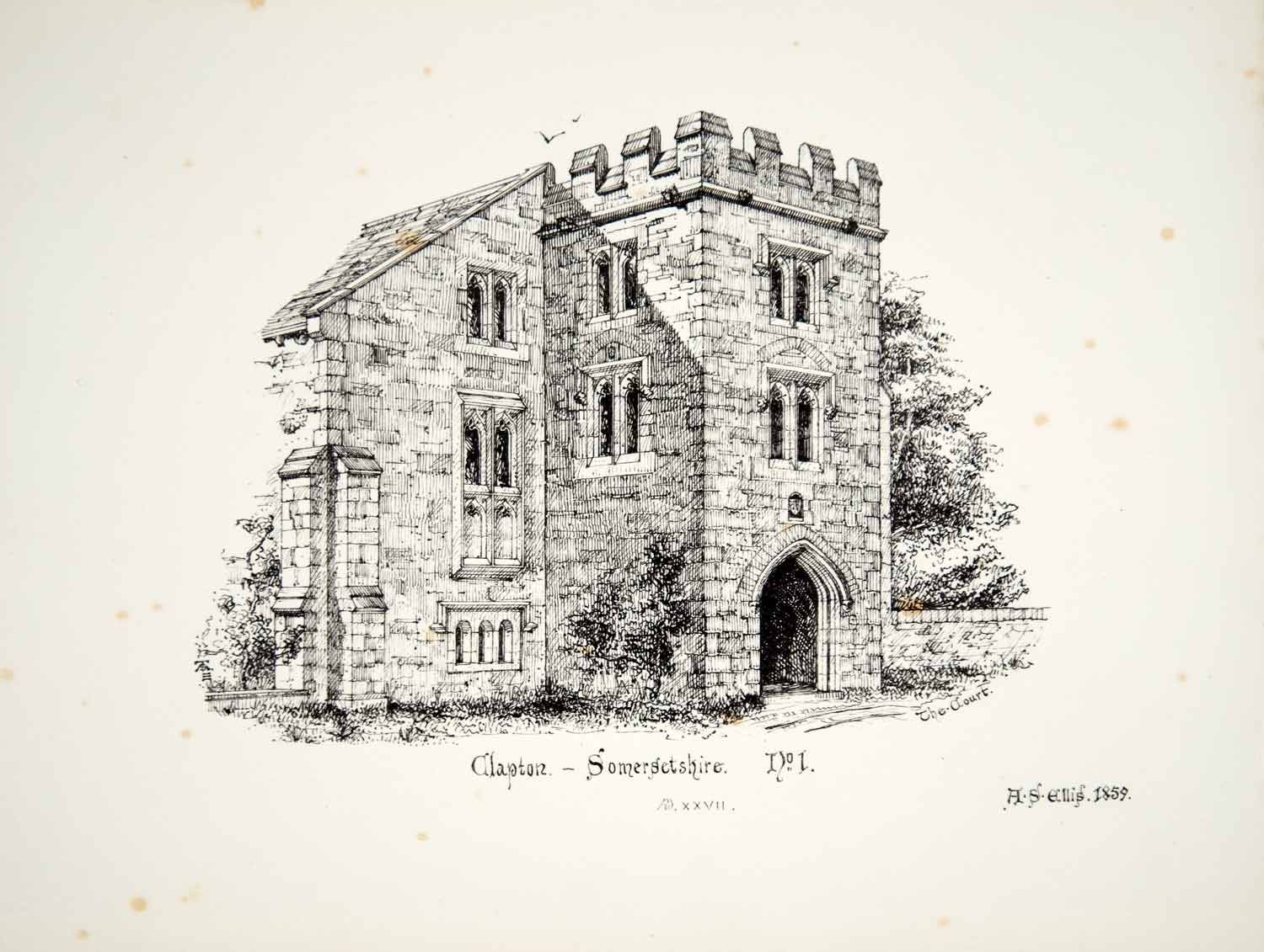 This is an original 1859 black and white lithograph of an illustration by A.S. Ellis of the Church of St. Michael and Clapton Manor house in Clapton in Gordano, Somerset, England, United Kingdom.