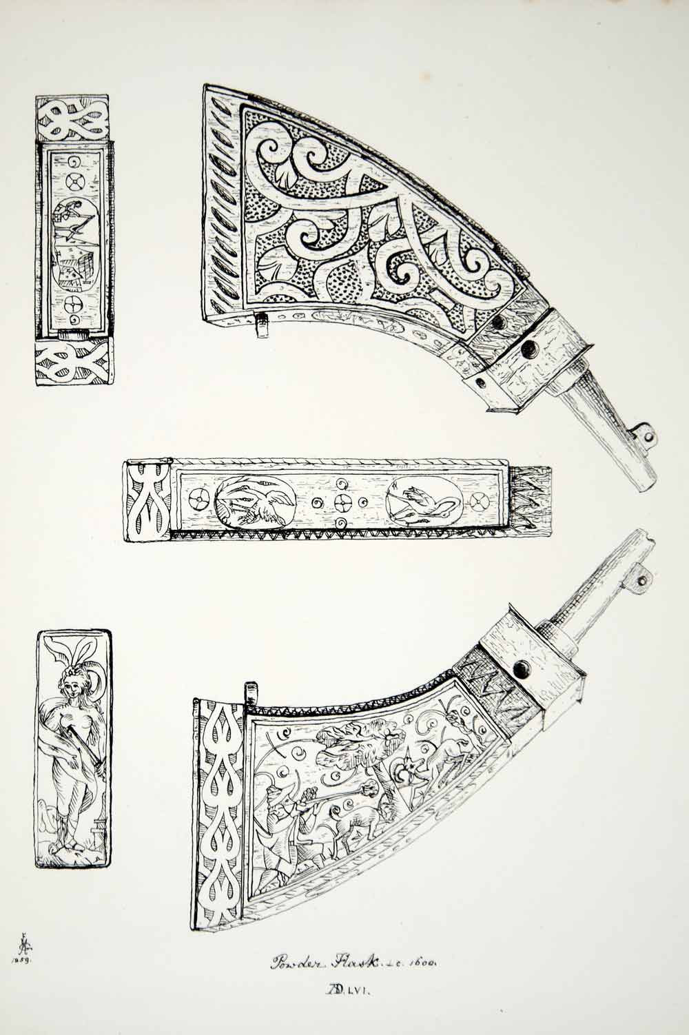 This is an original 1859 black and white lithograph of an illustration by Rev. John M. Gresley of a 17th century powder flask.