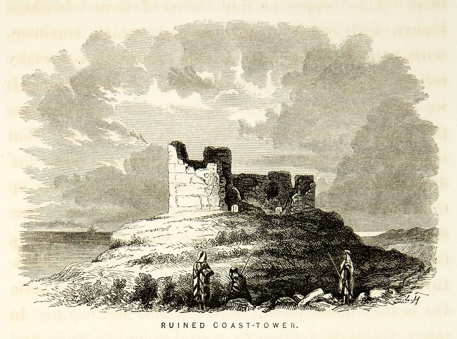 This is an original 1859 black and white wood engraving of a ruined coastal watch tower in Lebanon.