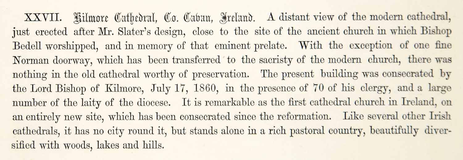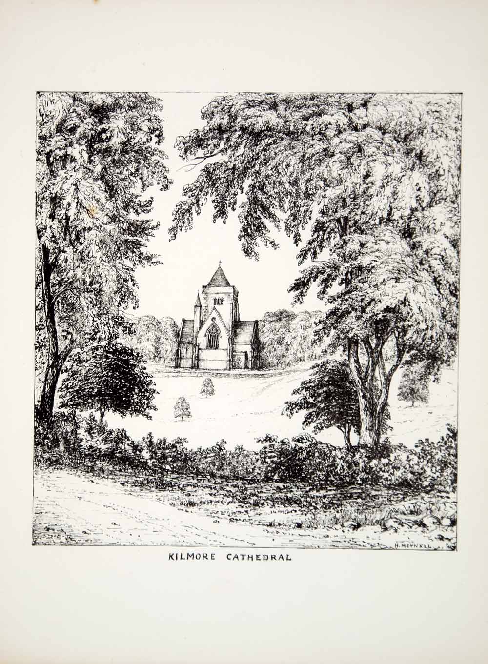 This is an original 1860 black and white lithograph of a drawing by H. Meynell of Kilmore Cathedral in County Cavan, Ireland.