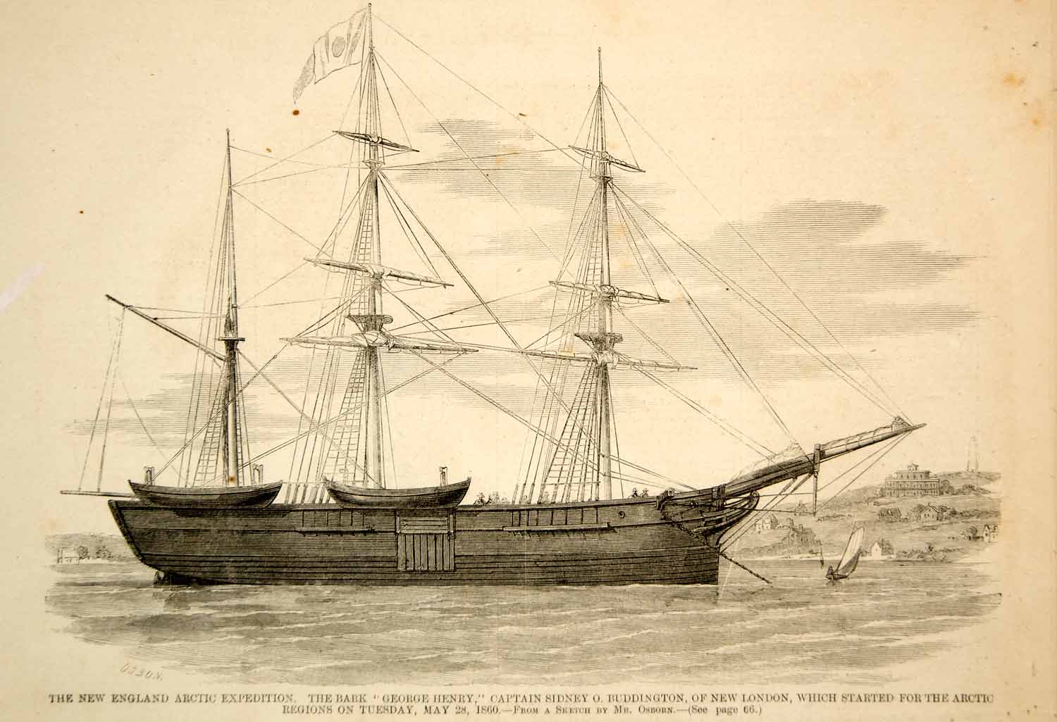 This is an original 1860 black and white in-text wood engraving of a drawing of the whaler George Henry under Captain Sidney O. Budington, used by Arctic explorer, Charles Francis Hall, on his First Arctic Expedition 1860-1863.