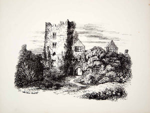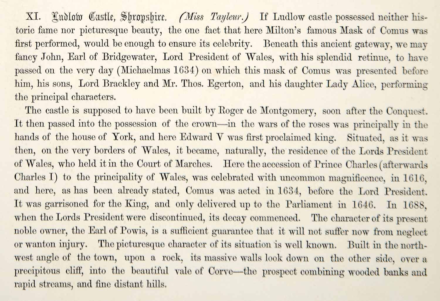 This is an original 1861 black and white lithograph of a drawing by Miss H. Tayleur of the Norman, Medieval and Tudor architecture of Ludlow Castle in Shropshire, England, United Kingdom. The castle is believed to have been founded by Walter de Lacy in the late 11th century during the late Middle Ages.