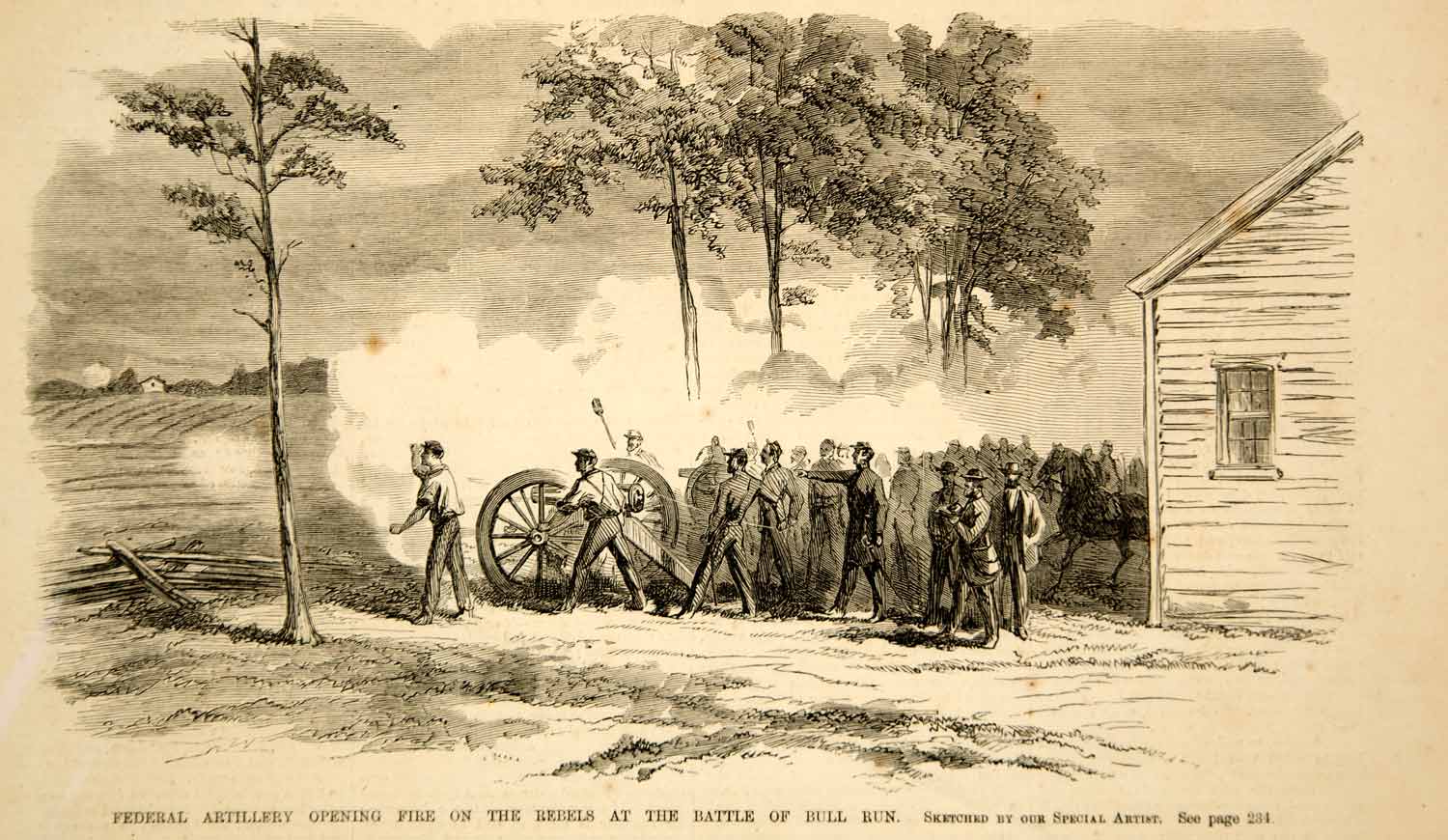 This is an original 1861 black and white in-text wood engraving of a sketch of the Union artillery opening fire on the Confederates at the First Battle of Bull Run (also known as First Manassas) during the American Civil War.