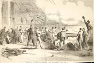 This is an original 1861 black and white in-text wood engraving of a sketch by A. Waud of the deck of the USS Pawnee, a sloop-of-war during the American Civil War.