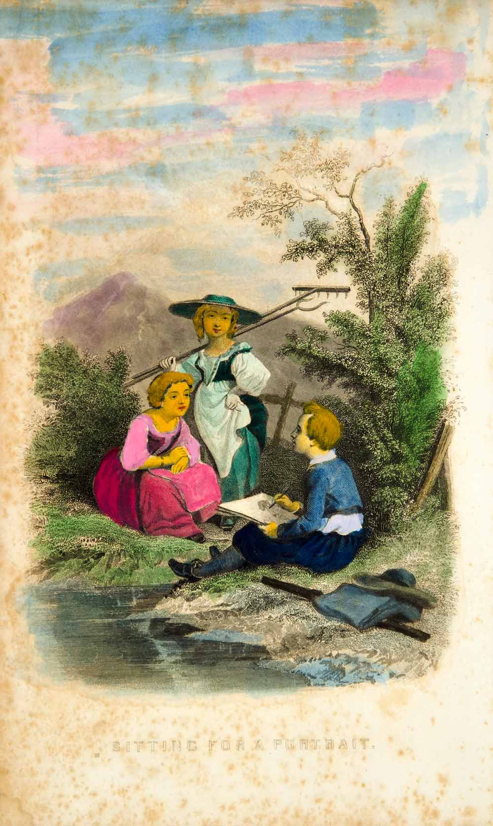 This is an original 1862 hand-tinted color steel engraving of a young artist at work.