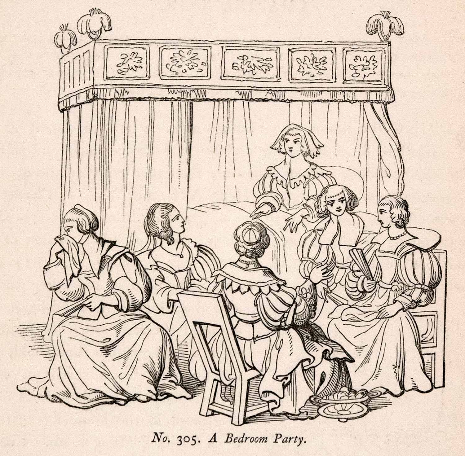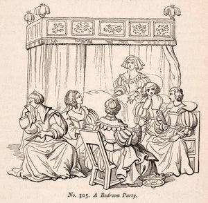 This is an original 1862 monochrome wood engraving titled "A Bedroom Party."