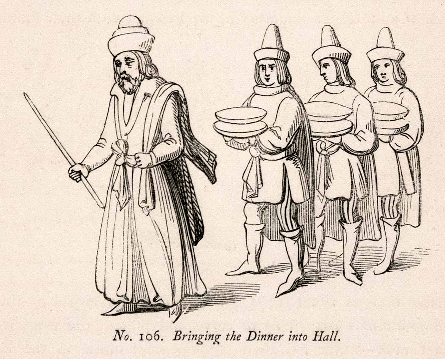 This is an original 1862 monochrome wood engraving titled "Bringing the Dinner into Hall."