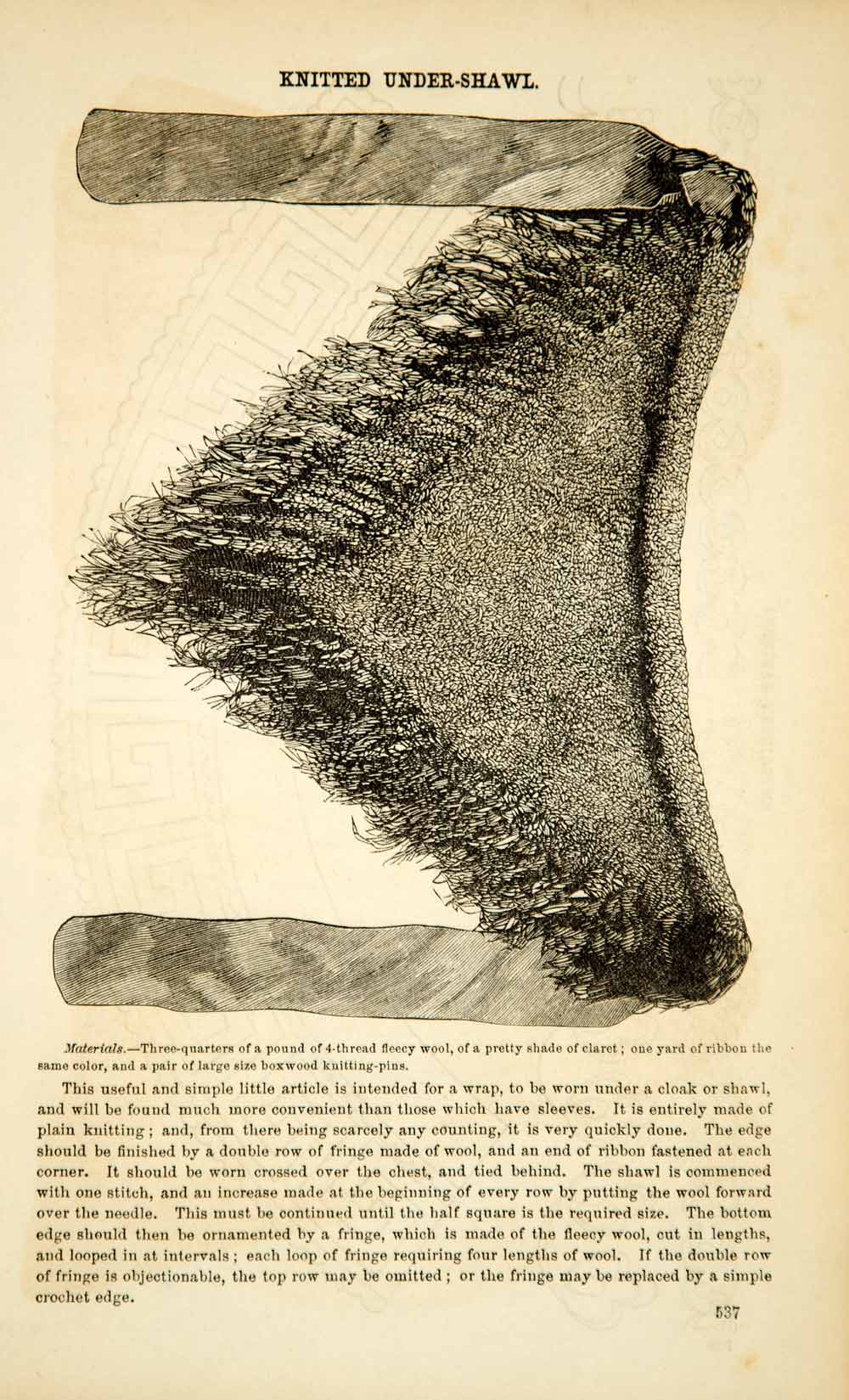 1862 Wood Engraving Victorian Knitted Undershawl Shawl Wrap Antique YGLB1
