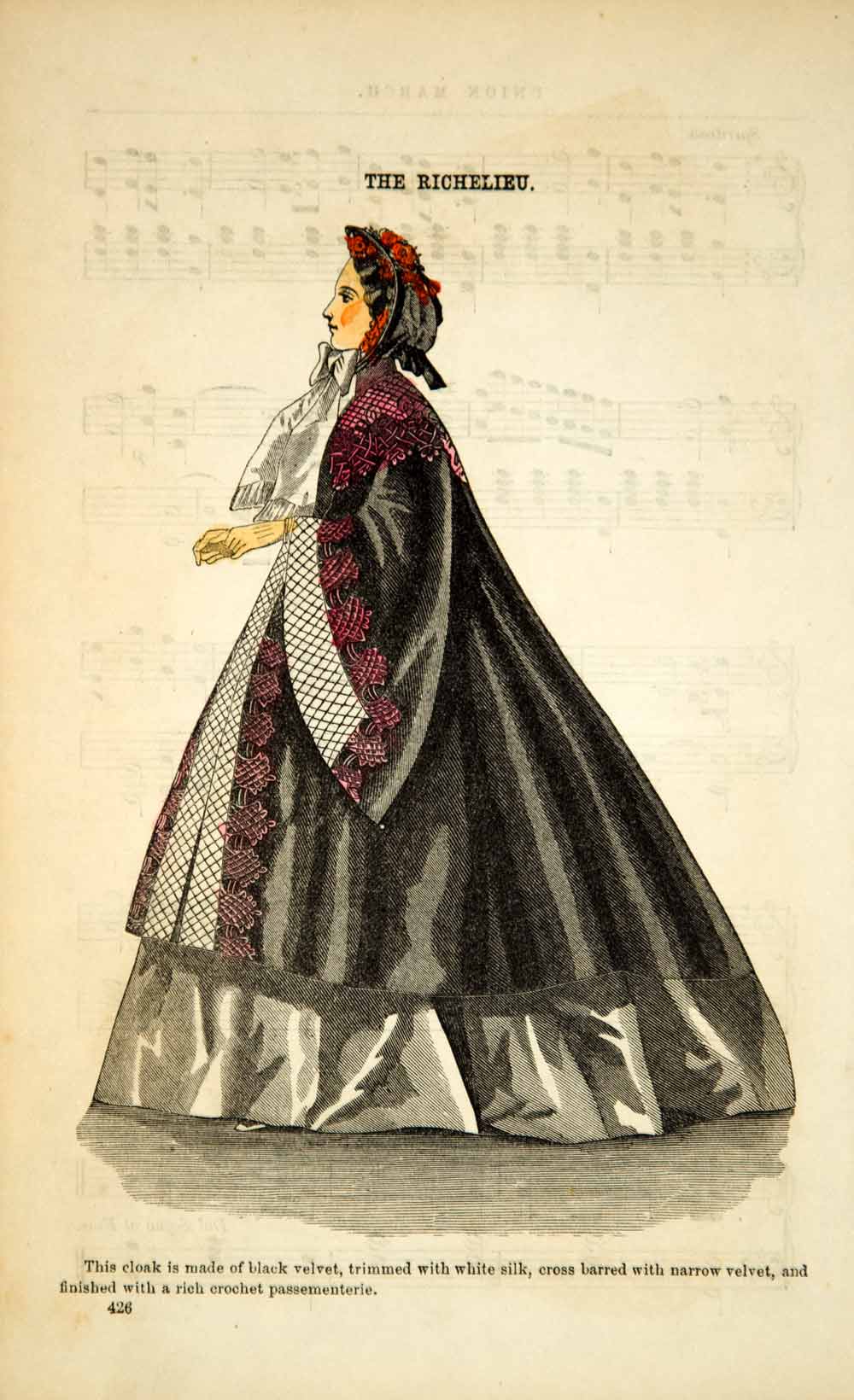 1862 Wood Engraving Victorian Lady Cloak Passementerie Godey's Fashion YGLB1
