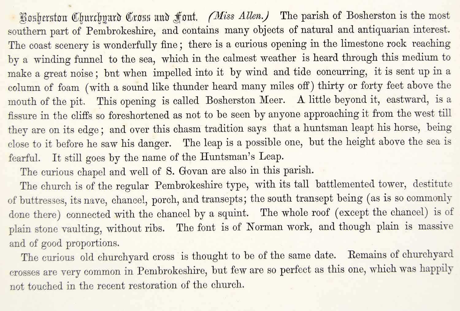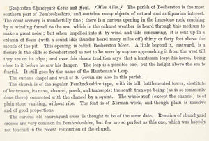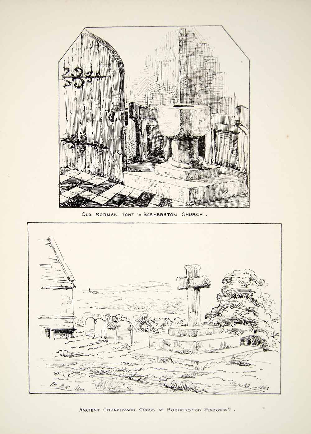 This is an original 1863 black and white lithograph of drawings by M.A.H. Allen of the old Norman baptismal font and the ancient cross in the churchyard of St. Michael's Church in the village of Bosherston, South Pembrokeshire, Wales, United Kingdom.