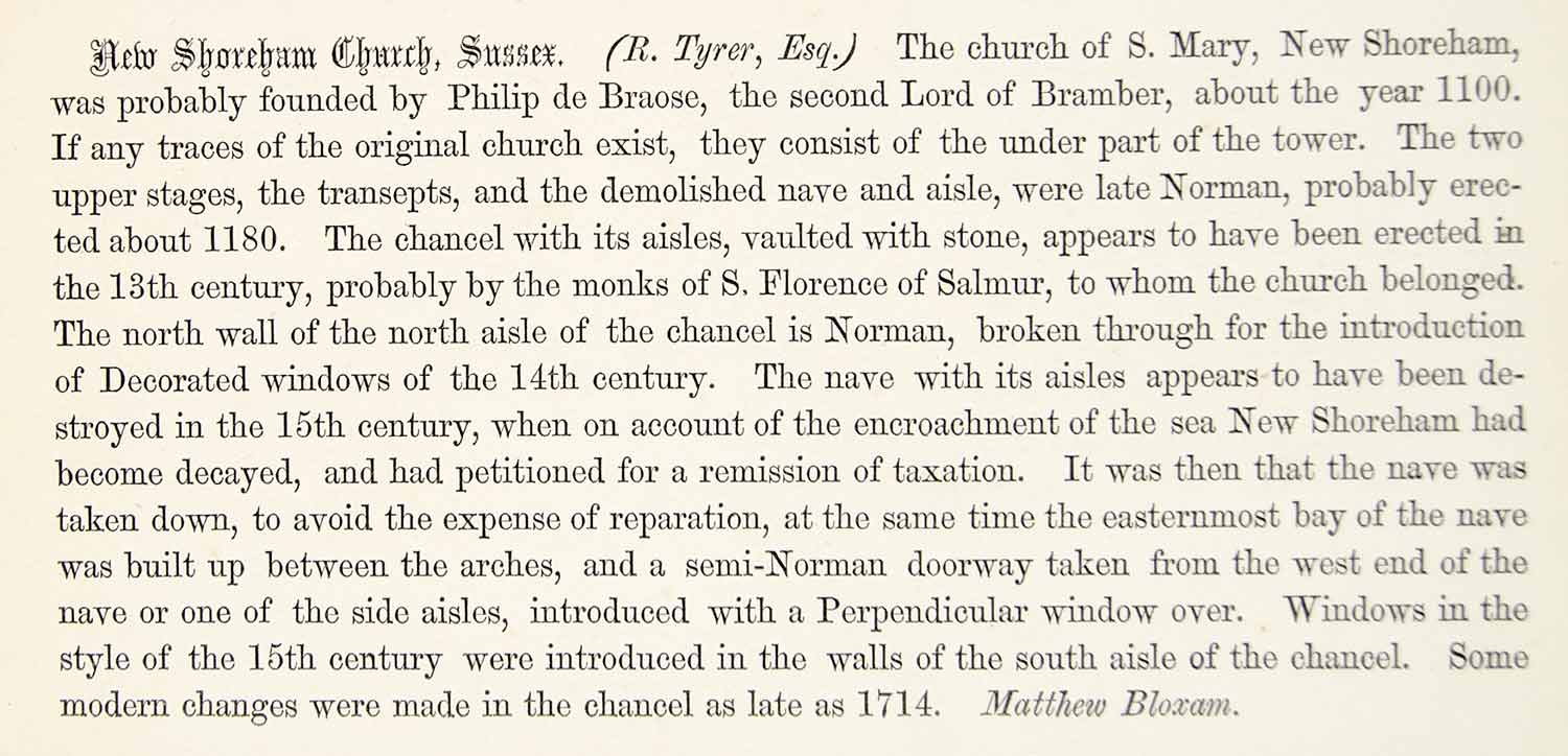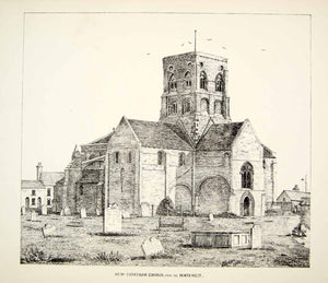 This is an original 1863 black and white lithograph of a drawing by Richard Tyrer of the Norman architecture of St. Mary de Haura Church in Shoreham-by-Sea, West Sussex, England, United Kingdom. The church was founded in 1096 CE during the Middle Ages. It is also a Grade I listed building by English Heritage.