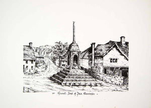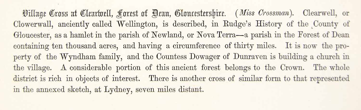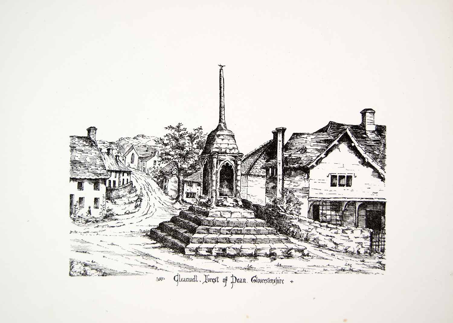 This is an original 1864 black and white lithograph of a drawing by L.M. Crossman of the village cross in Clearwell in the Forest of Dean, West Gloucestershire, England, United Kingdom. The village is famous for its mining operations that date back over 7,000 years.
