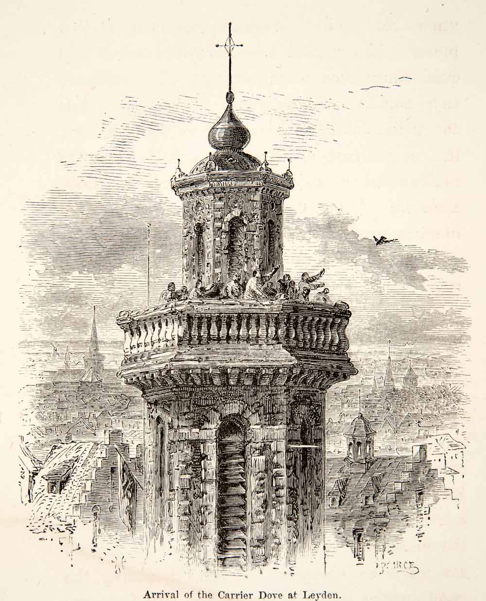 This is an original 1867 black and white relief line-block print of the arrival of the carrier dove, in Leiden, Holland.