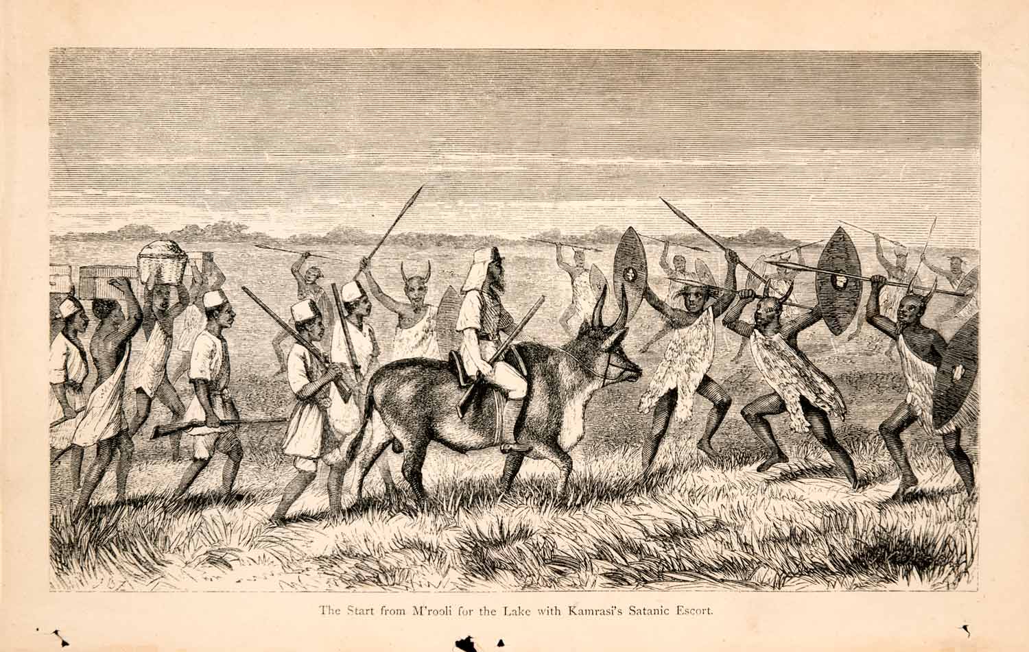 This is an original 1868 black and white wood engraving of the start from M'rooli for the Lake with Kamrasi's Satanic escort.