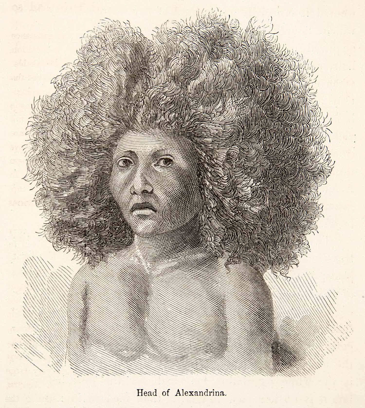 This is an original 1868 black and white wood engraving portrait of a woman, her hair large and unruly.