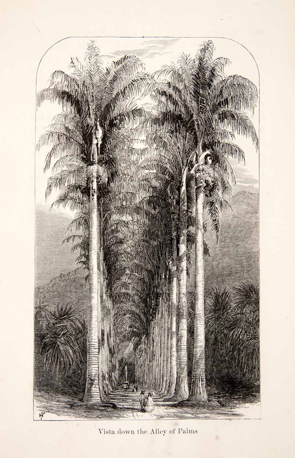 This is an original 1868 black and white wood engraving of an avenue created by palm trees, in Brazil.
