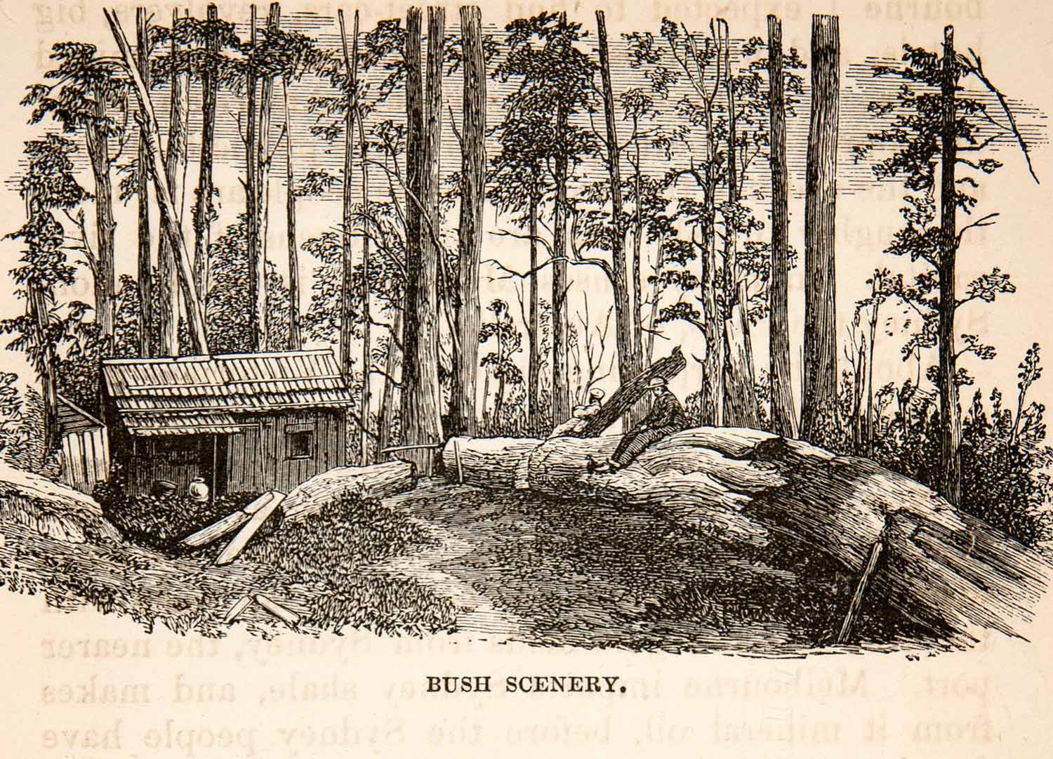 This is an original 1869 monochrome wood engraving of "Bush Scenery." This nineteenth century image depicts the rugged terrain of the American West as it appeared shortly after the California Gold rush of 1848 to 1855.