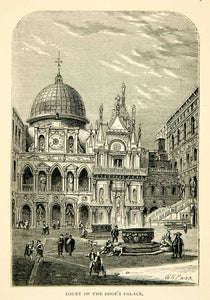 This is an original 1869 monochrome in-text wood engraving of the historic Venetian Gothic architectural facade of the Doge's Palace (Palazzo Ducale) and its courtyard that are located in the city of Venice, Italy in Europe.