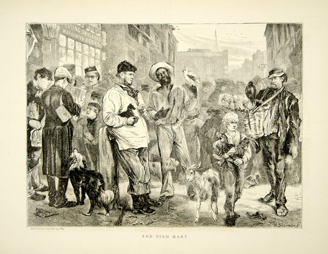 1869 Wood Engraving Edwin Buckman Art Bird Market London England Victorian YTG1