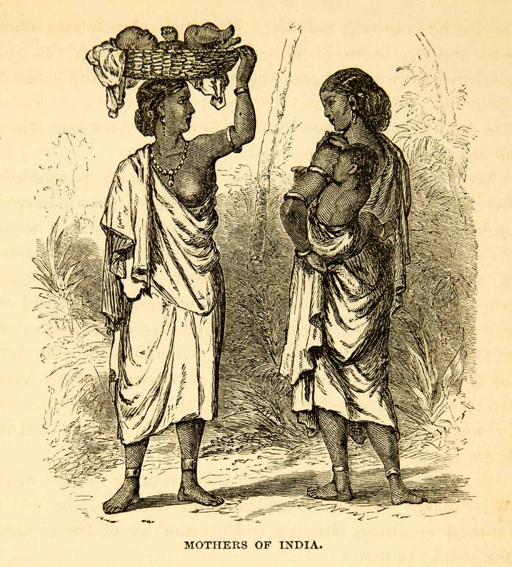 This is an original 1869 black and white in-text wood engraving that depicts two Indian mothers carrying their children in ways that appear at odds with western norms.