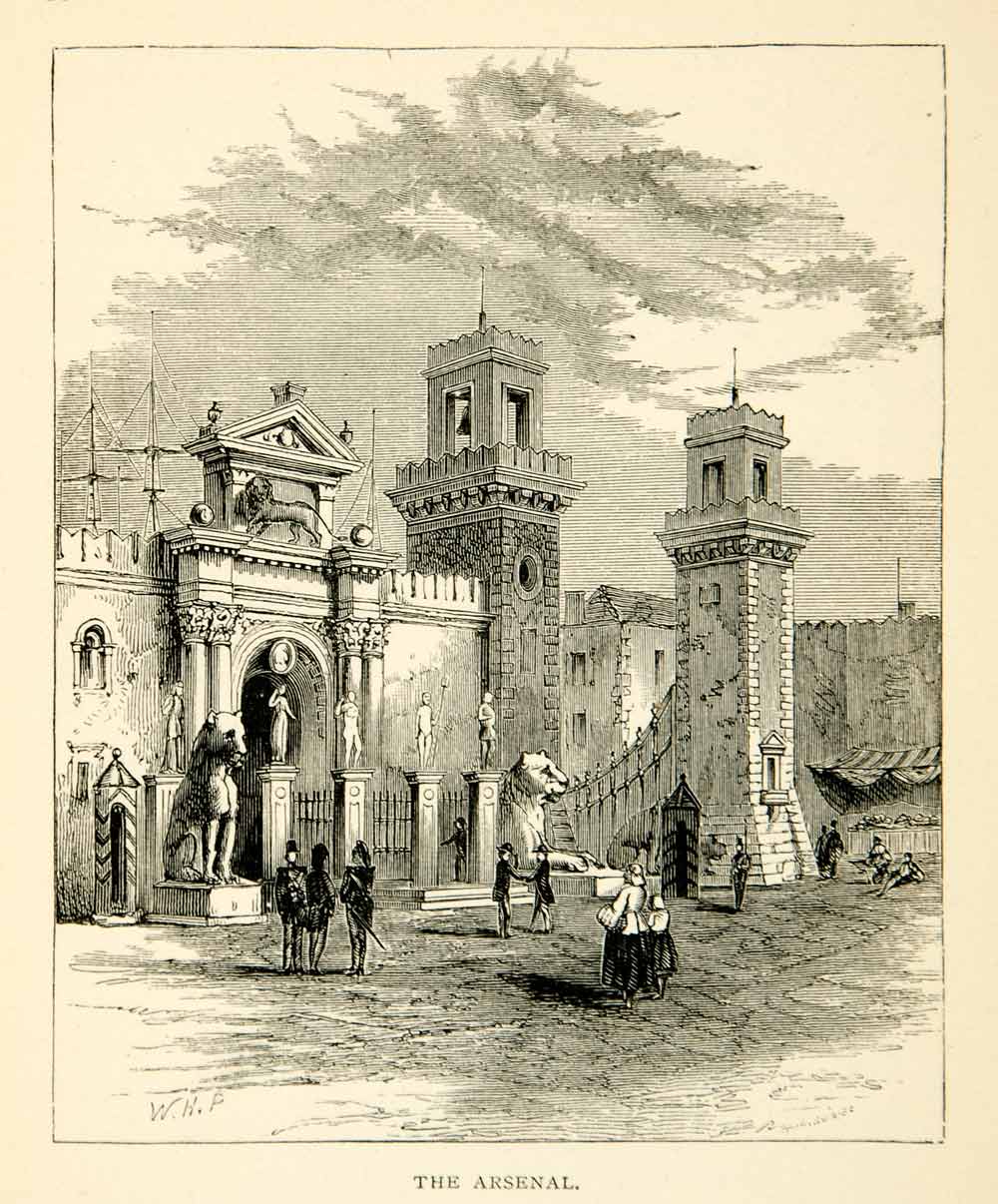 This is an original 1869 monochrome in-text wood engraving of the Porta Magna gate at the Venetian Arsenal in the city of Venice, Italy in Europe.