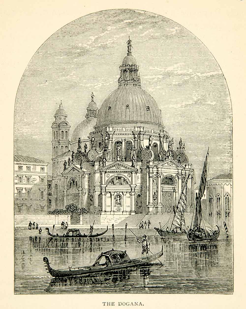 This is an original 1869 monochrome in-text wood engraving of the historic architectural facade of the Punta della Dogana (Dogana da Mar) that is located along the Grand Canal in the city of Venice, Italy in Europe.