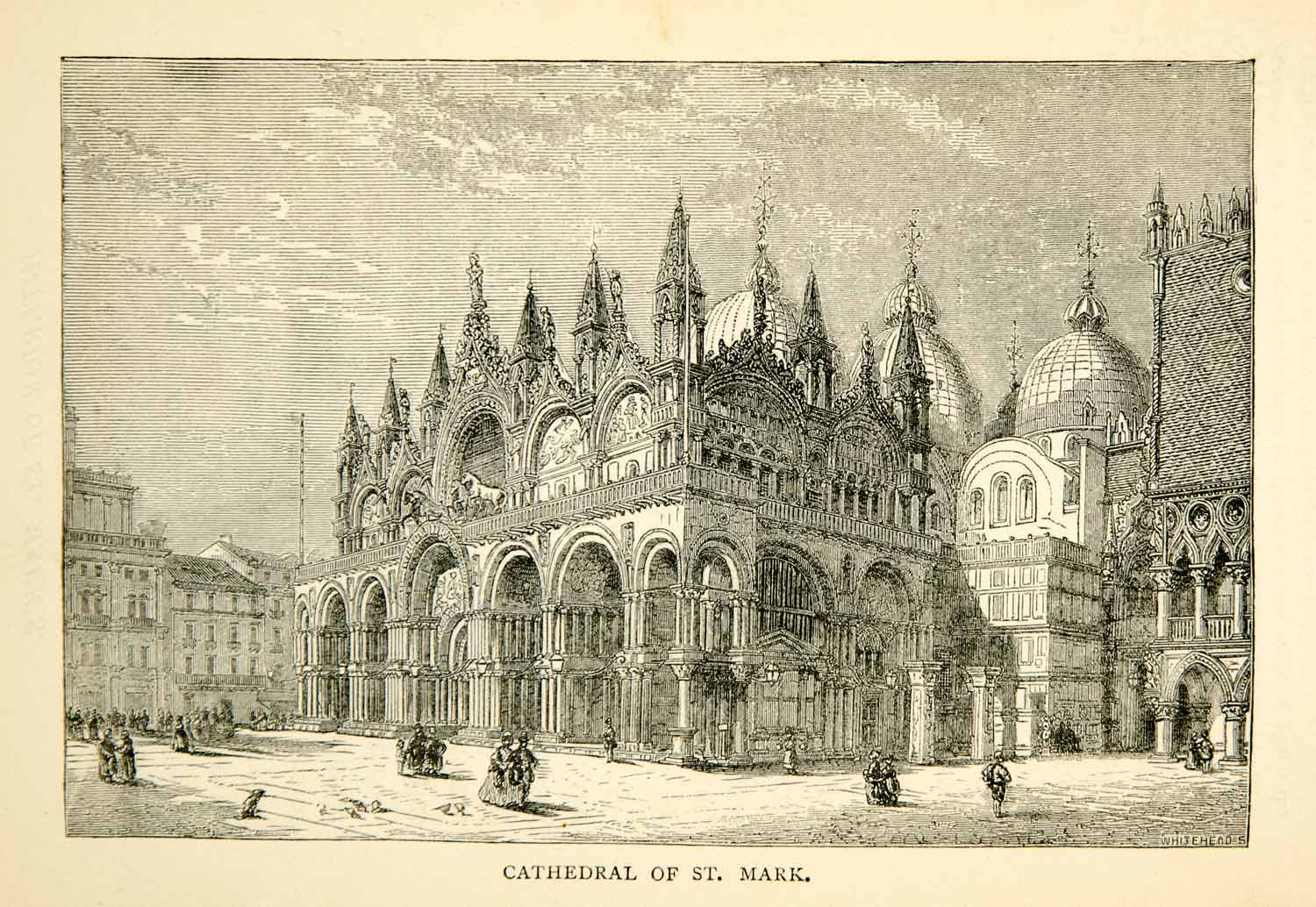 This is an original 1869 monochrome wood engraving of the historic Italo-Byzantine architectural facade of St. Mark's Basilica (Basilica Cattedrale Patriarcale di San Marco) that is located in the city of Venice, Italy in Europe.