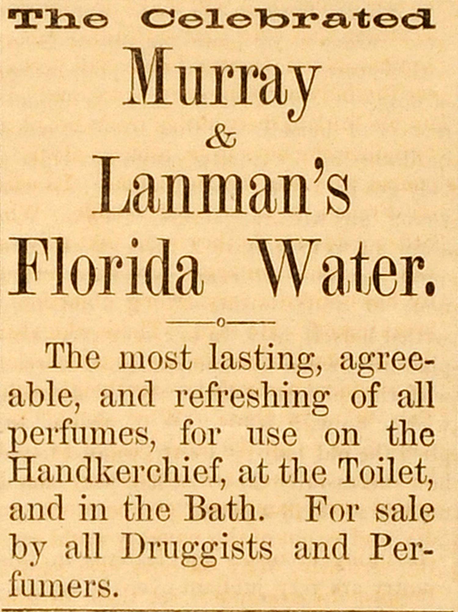 This is a small original 1870 black and white print ad for Murray and Lanman's Florida Water, a perfume for the handkerchief and more.