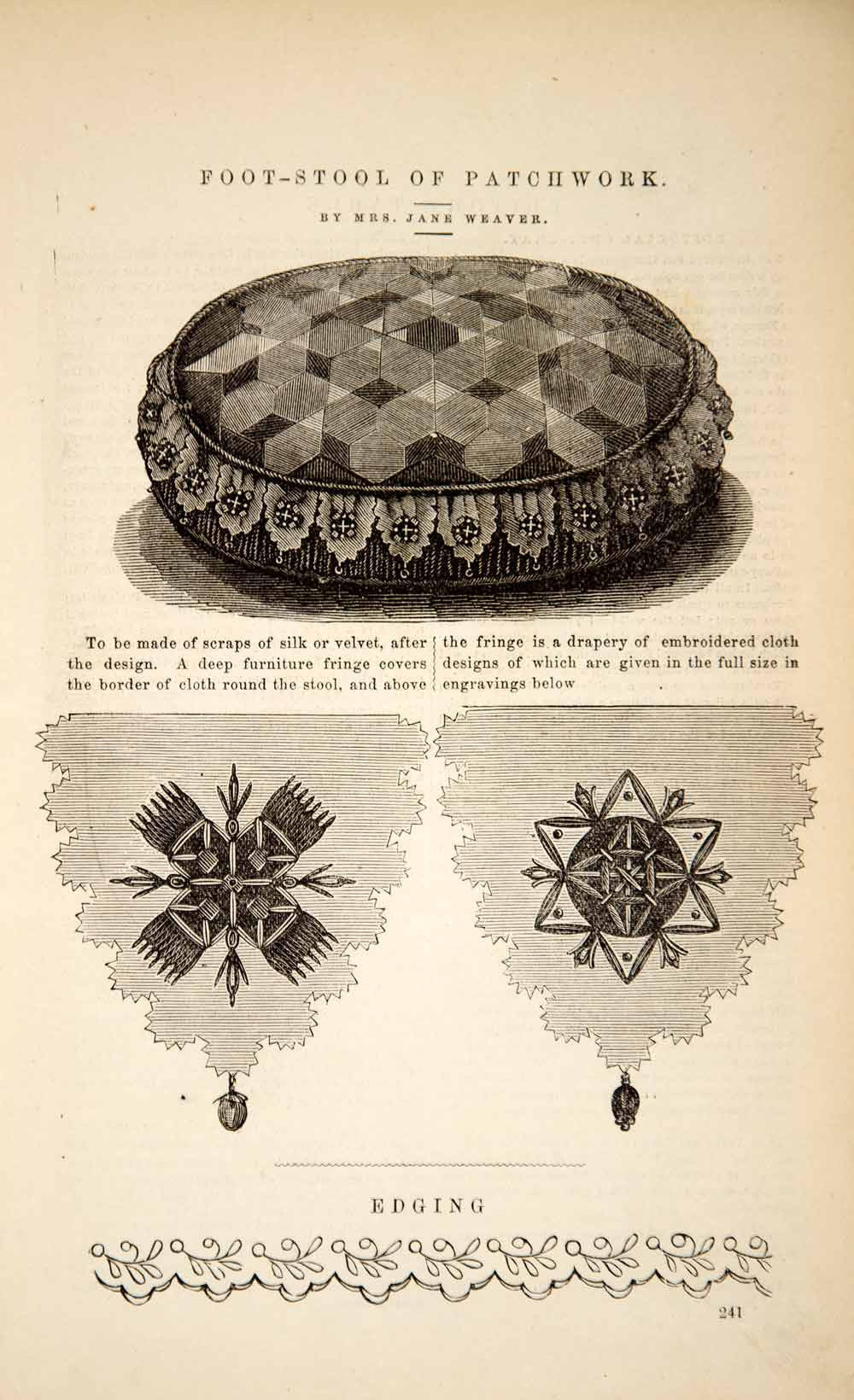 This is an original 1870 one-page black and white print article by Mrs. Jane Weaver on how to make this footstool, with a trimming of fringe, from scrapes of velvet and silk.