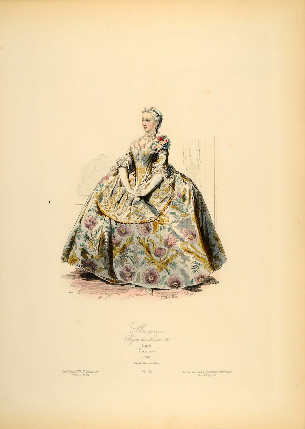 This is an original 1870 hand-colored copper engraving of the elegant dress worn by a French Marquise during the reign of Louis XV of France, from a painting by Nicolas Lancret.