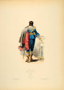 This is an original 1870 hand-colored copper engraving of the costume of a French noble during the reign of Louis XIII of France, after a work by Bosse.