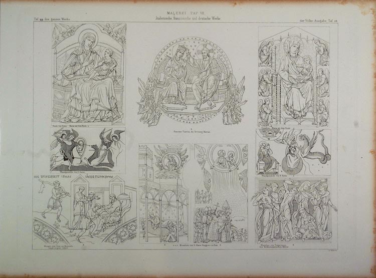 This is an original 1870 lithograph that shows some examples of Italian, French, and German church paintings and mosaics including: Mary with the Child, Guido of Siena; Mary with the Child, Cimabue; Coronation of Mary, Mosaic by J. Turriti; Mosaics on the Facade of S. Maria Maggiore at Rome; Jacob and Isaac, Mosaic on the Cathedral of Monreale; Wall Paintings from the Apocalypse, in the Church of S. Savin; and The Mothers of Bethlehem in Mourning, a miniature.