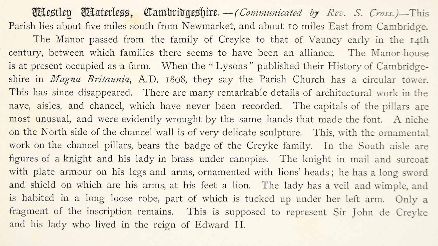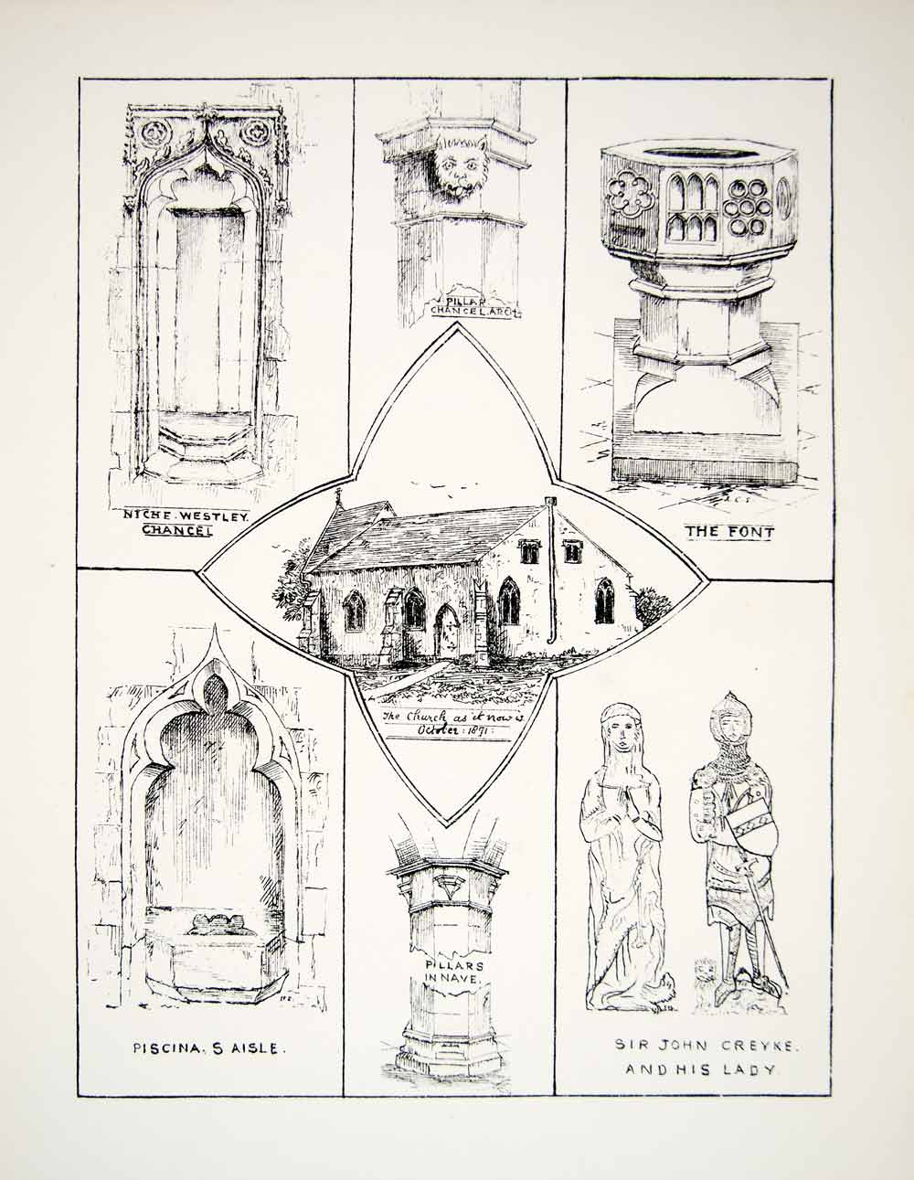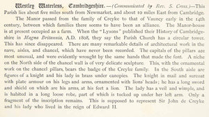 This is an original 1871 black and white lithograph of a drawing by Rev. S. Cross of the chancel, pillars, baptismal font, piscina, and figures of Sir John de Creke and his wife Alyne Clopton, from inside St. Mary's Church in the village of Westley Waterless, Cambridgeshire, England, United Kingdom.