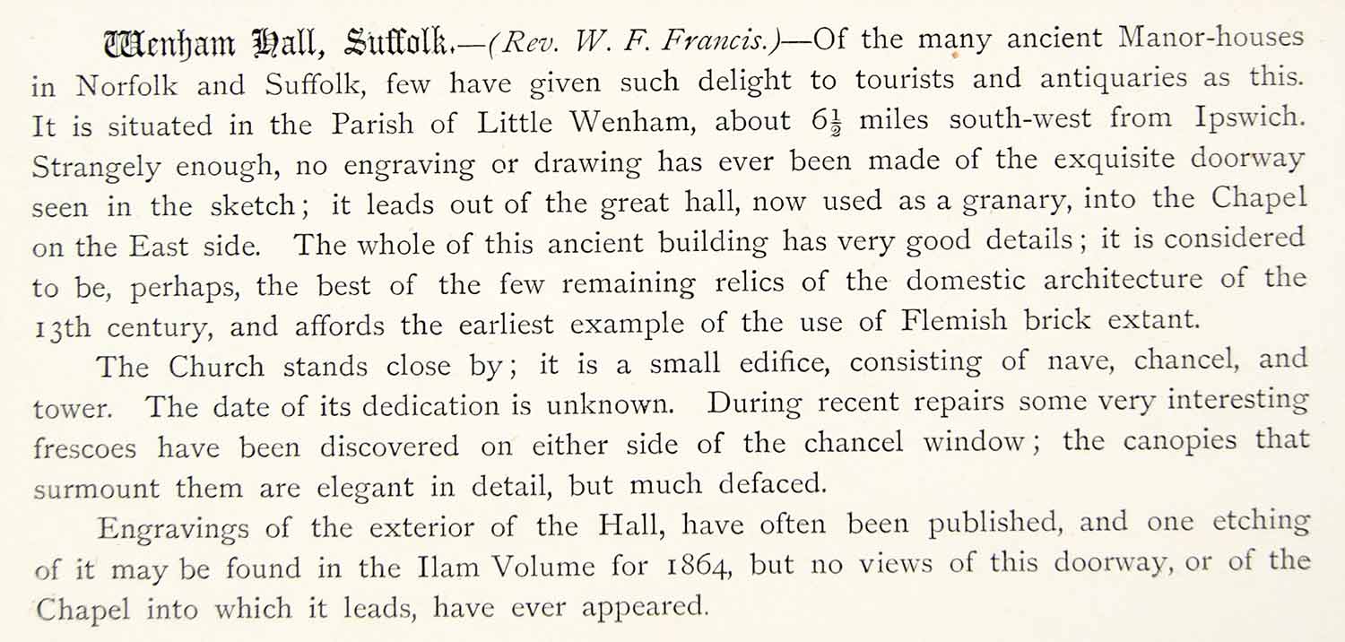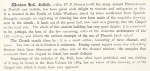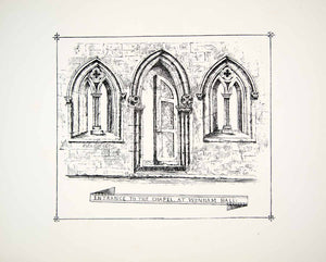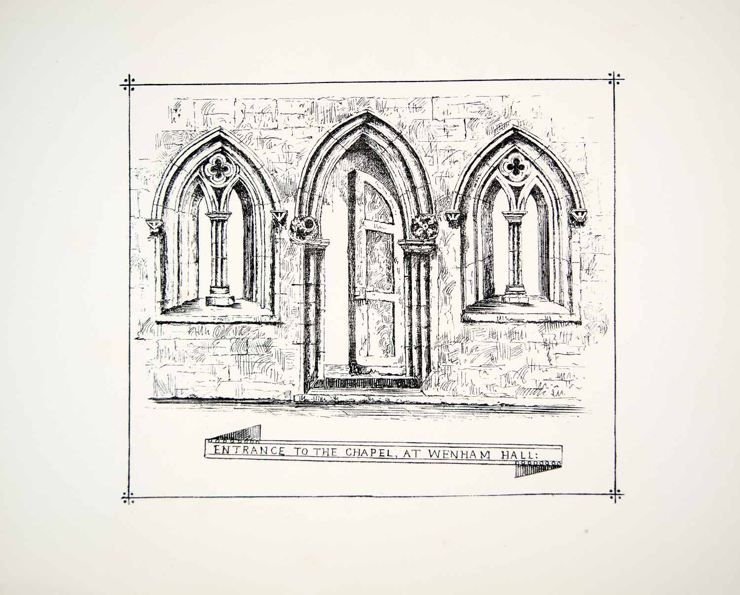 This is an original 1871 black and white lithograph of a drawing by Rev. W.F. Francis of the entrance to the chapel at Wenham Hall in Little Wenham, Suffolk, England, United Kingdom.