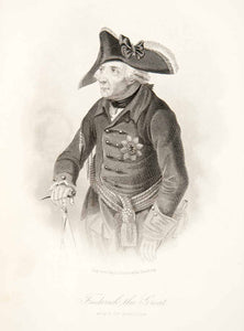 This is an original 1871 black and white steel engraving of Fredrick II, or otherwise known as Fredrick the Great or Old Fritz, was the King of Prussia.