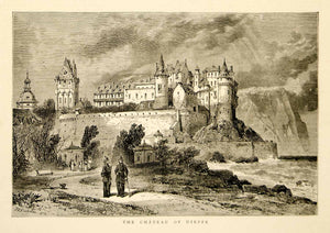 1871 Wood Engraving Art Chateau De Dieppe Castle Seine-Maritime France YTG2