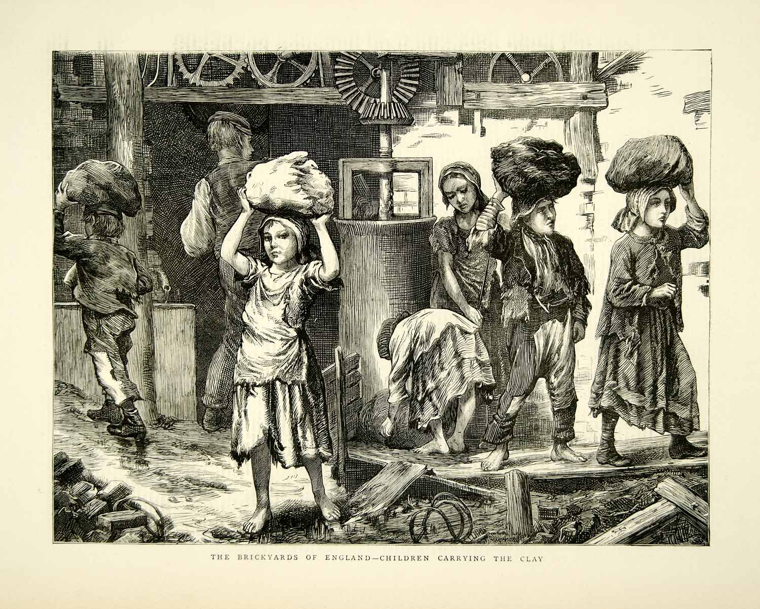1871 Wood Engraving Art England Brickyard Victorian Children Clay Labor YTG2