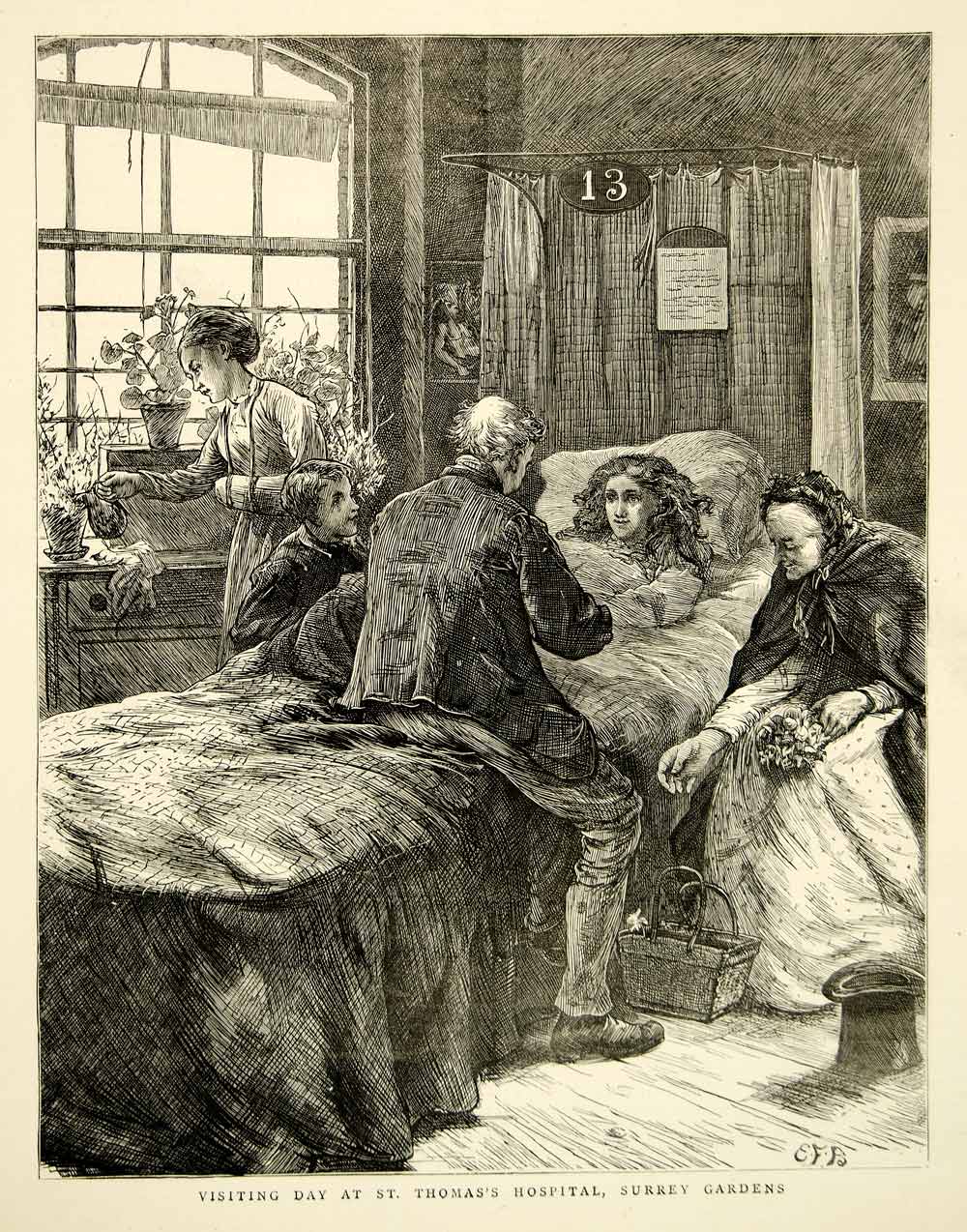 Keywords specific to this image: Medicine, Medical, Health, Nurse, Physician, Room, Patient, Sickness, Ailment, Illness, Disease, Treatment, Flowers, Bouquet, Basket, Grandparents, Elderly, Old, Child, Boy, Top Hat, Plants, Room, Interior, British, English, Visiting Day